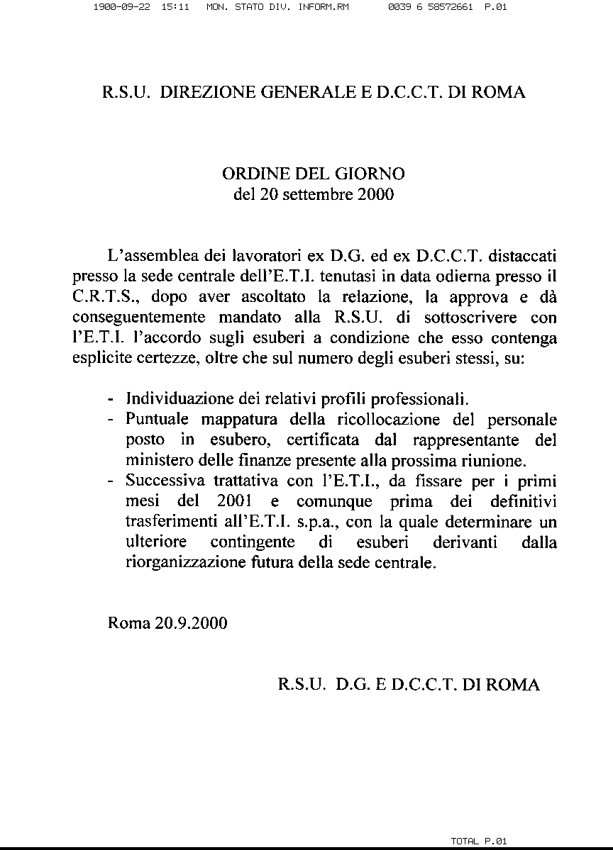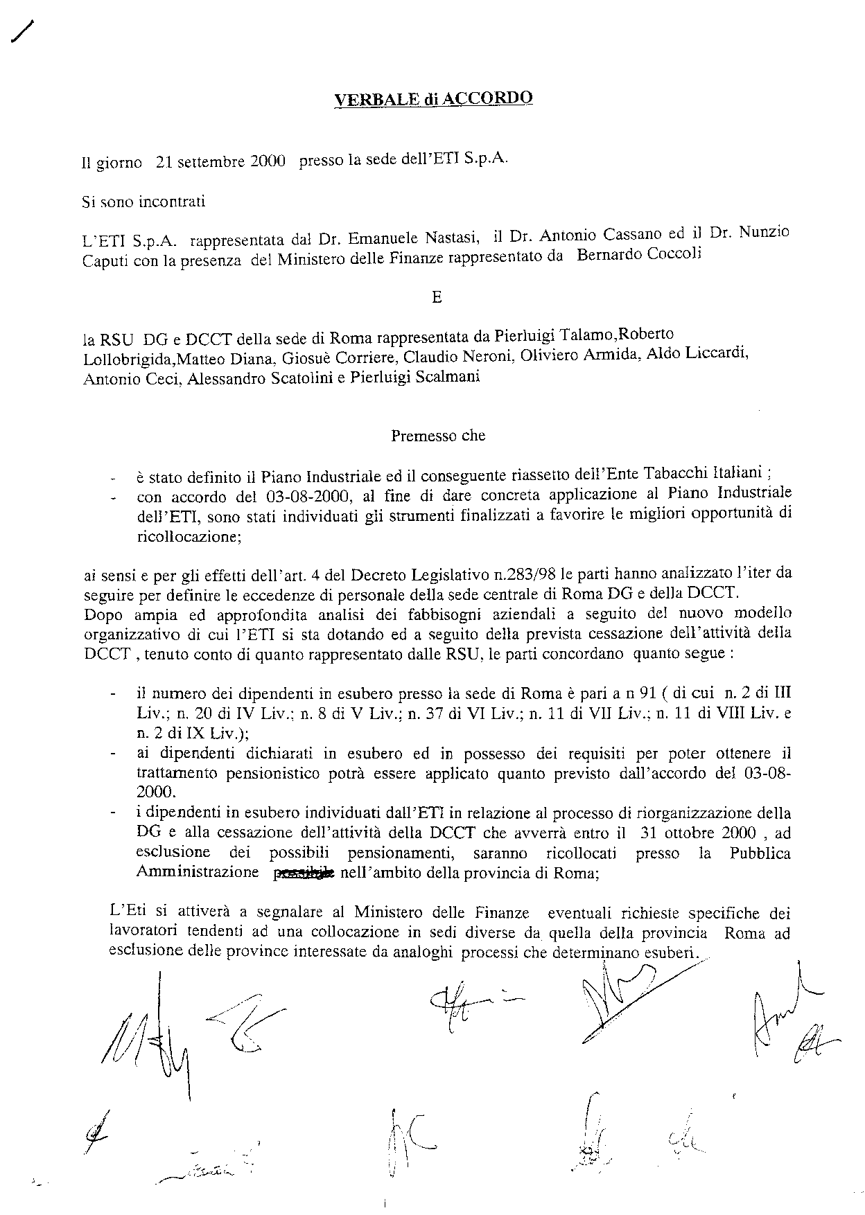 E' stato firmato il 21/9/2000 tra l'ETI e la RSU della Direzione Generale e della D.C.C.T. di Roma l'accordo che darà luogo alla prima ondata di esuberi (91 persone) di questa ristrutturazione.