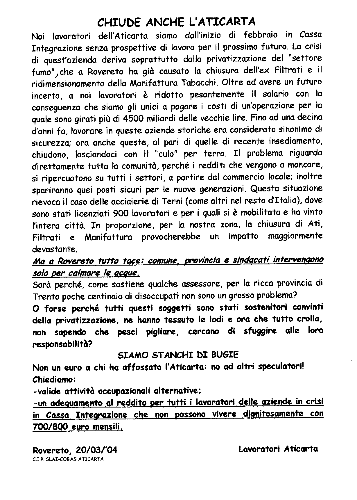 * 20/3/2004 : Volantino ATICARTA Rovereto ancora in cassa integrazione"