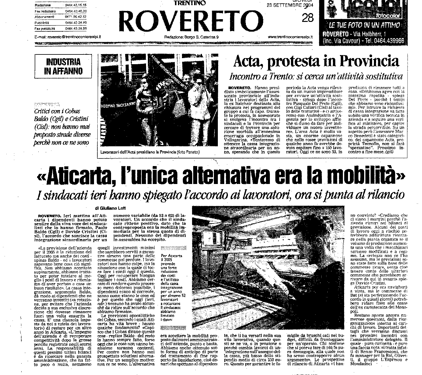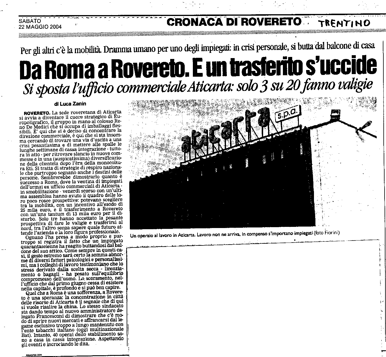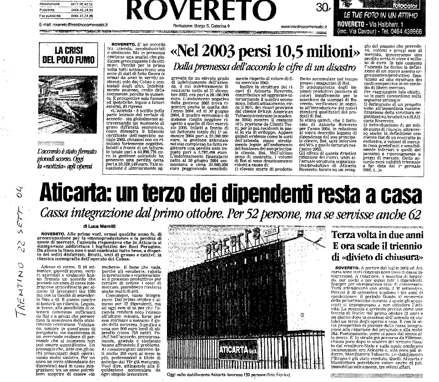 * 22/9/2004 : Cassa integrazione per un anno all'Aticarta di Rovereto