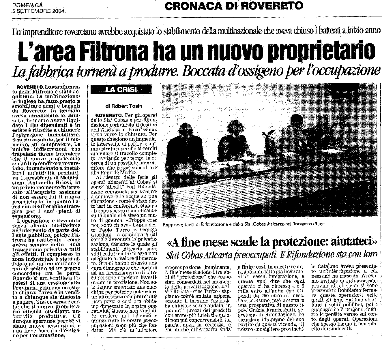 * 5/9/2004 : Venduta la sede della Filtrona di Rovereto